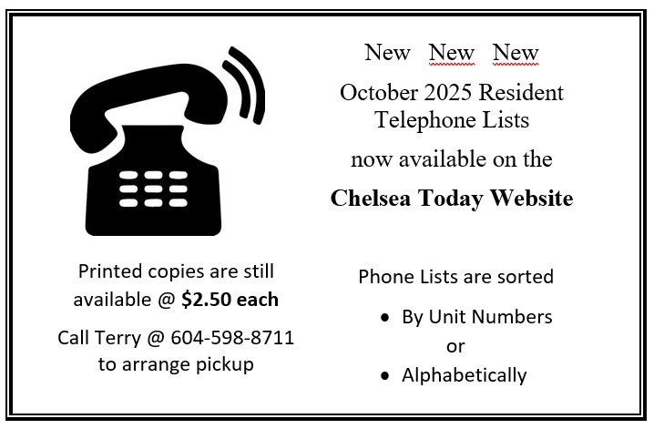 If you are new to Chelsea Gardens , if your name has not been included, if your information is incorrect or has changed, please contact Terry Hyde at 604-598-8711.