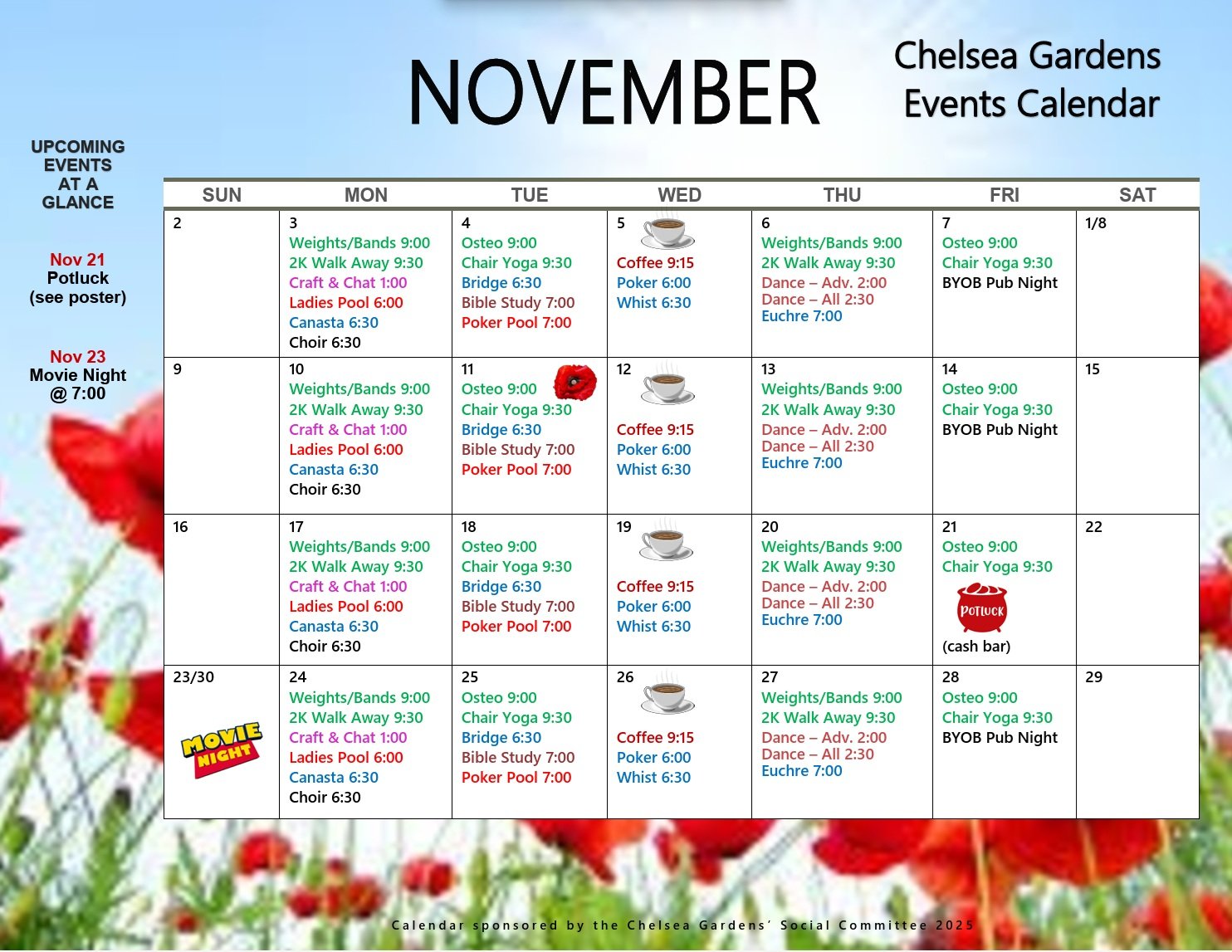Below is the November events Calender (Thanks Linda for creating this). The Calender is available any time via MENU: EVENTS CALENDER.