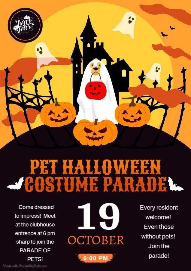 Yes – time to dress up your favorite canine (or other pet) and join the gang the pet Halloween costume parade Sunday October 19th. Meet at the clubhouse entrance at 06:00 PM – everyone welcome.