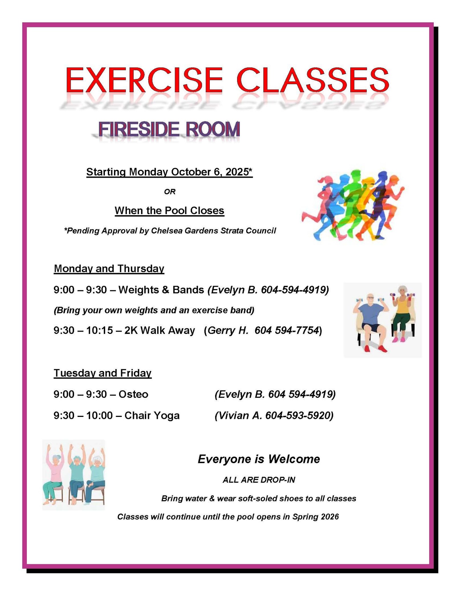 Below is the exercise class fall schedule in the Fireside room.