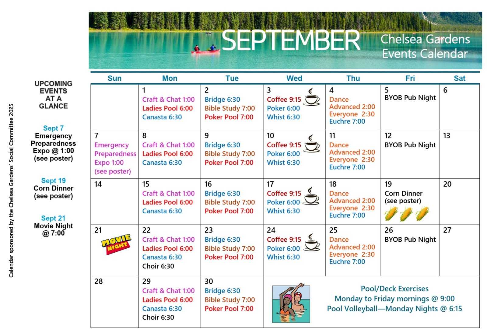 Below is a September events Calender. The Calender can also be viewed at any time via the MENU: EVENTS CALENDAR